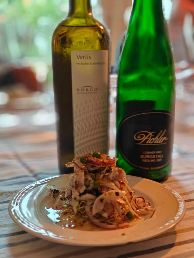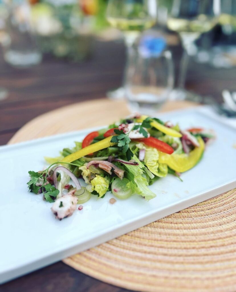 De wijnen worden gecombineerd met eten. In mijn gerechten gebruik ik lokale smaken die passen bij de wijnen. Het eten kan op 2 verschillende manieren worden geserveerd: